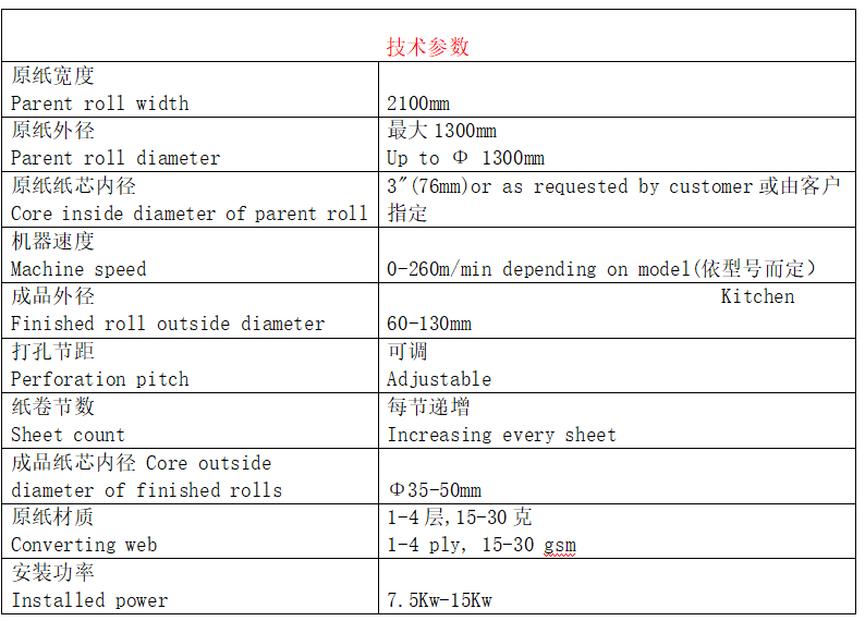 1.最大紙(zhǐ)寬2100mm,打孔間距可調,以滿足不同長度(dù) 要求。此複卷機(jī)最(zuì)高(gāo)速度可達260米/分。它包括: 後架裝置,壓花裝置,複(fù)卷裝置。 2、該型號複卷生產線將會自動換卷,並將紙卷(juàn)彈出,再自動(dòng)修邊,給紙卷噴膠、封口,留出約20mm的紙尾,方便消費者使用時拉(lā)出紙卷,而不(bú)會撕爛紙(zhǐ)卷。 3、傳動係統(tǒng)采用同步皮帶、尼龍皮帶和齒輪傳動,傳動平穩,而且方便維護。在生產線的不同位置裝有光電開關,隨時 檢測機器運行情況,如(rú)若出現原紙(zhǐ)運行完畢、無(wú)紙芯或其它意外情況,可自動停機。生產線(xiàn)的(de)主要部位還配有潤滑係統。 4、主電機功率為7.5kW,可調(diào)速變頻控製。(主電機功率依最後規格與要求確定)。 5、整條生(shēng)產線由PLC控製(zhì),品牌由客戶選定。