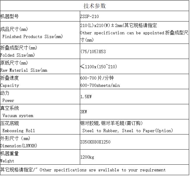 ZSSP-210型(xíng)壓花速你紙巾機采(cǎi)用(yòng)直空吸附開成型(xíng)經壓花、切斷、自動折疊而成體積小、便幹帶的手帕紙。本機運行軍穩、讀度快、折(shé)魯整,紙巾長度在68mm110mm圈內多種格可調,可根據多戶要求訂造花樣(yàng)。